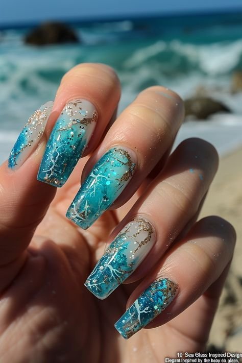 Use sheer blue or green polish with a matte finish to mimic the texture of real sea glass. Add subtle white swirls or dots for extra realism.