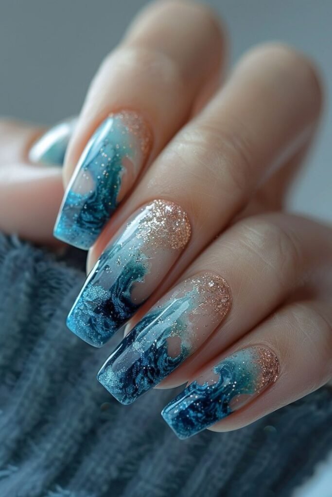 Start with a nude or light blue base, then swirl darker blues and whites across the tips to mimic cresting waves. Blend with a sponge for soft texture.