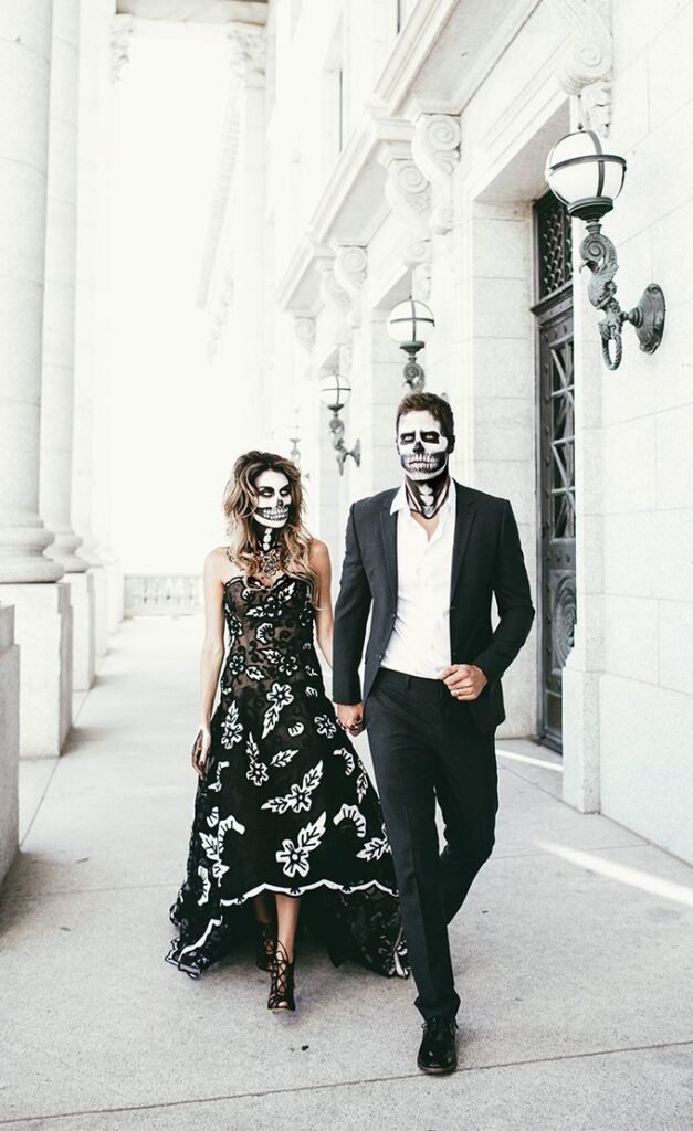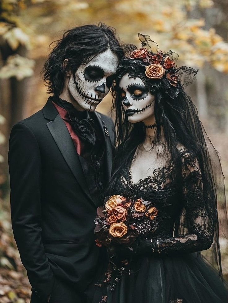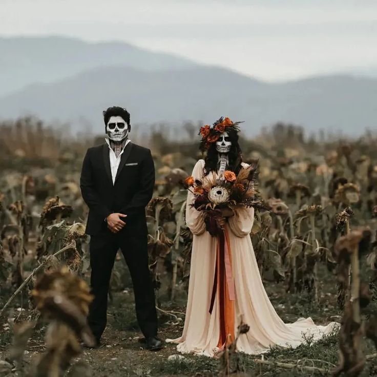 Channel Tim Burton vibes with a skeleton bride in tattered lace or a skeletal groom in a distressed tux. Add face paint, a black bouquet, or even a veil with spiderweb accents.