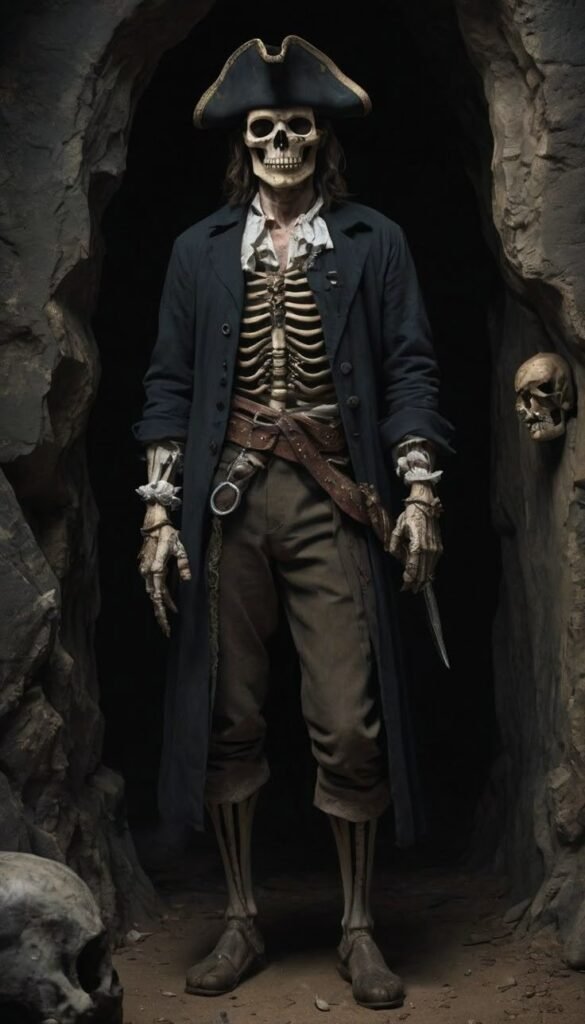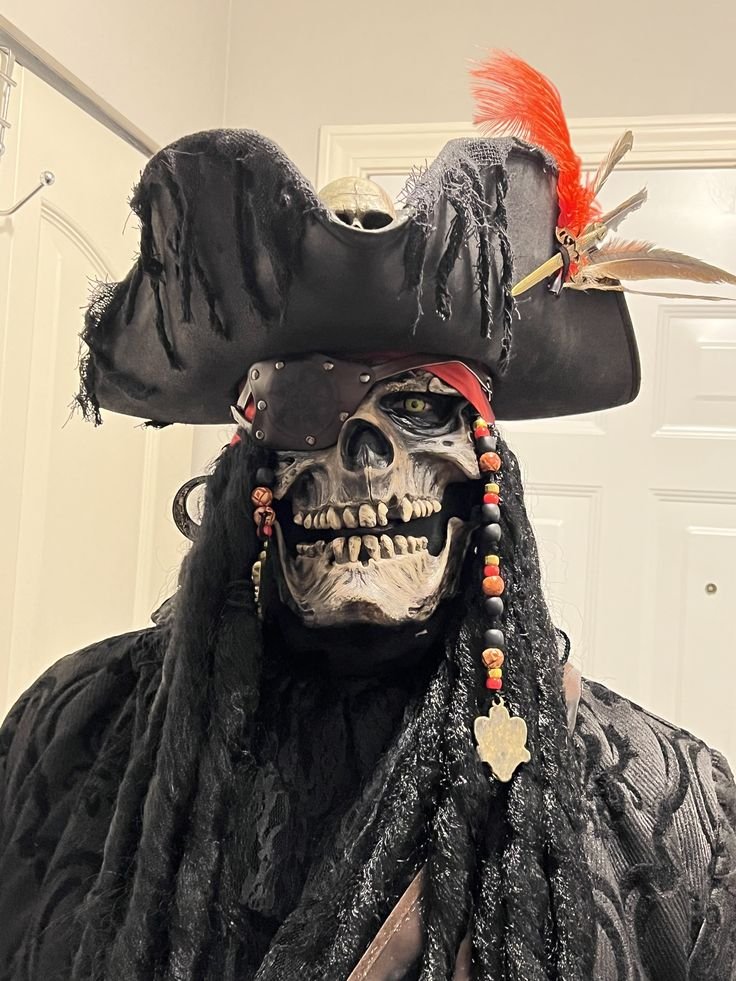 You get the ultimate spooky sailor. A skeleton pirate outfit combines a tattered pirate coat, tricorn hat, and skeletal body suit. Add in some fake seaweed or barnacles for that “risen from the depths” effect.