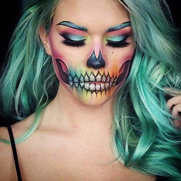 A rainbow skeleton look replaces black and white with bright neon or pastel tones. Think of each bone segment shaded in a different hue—a skull look that’s more dreamy than deadly.