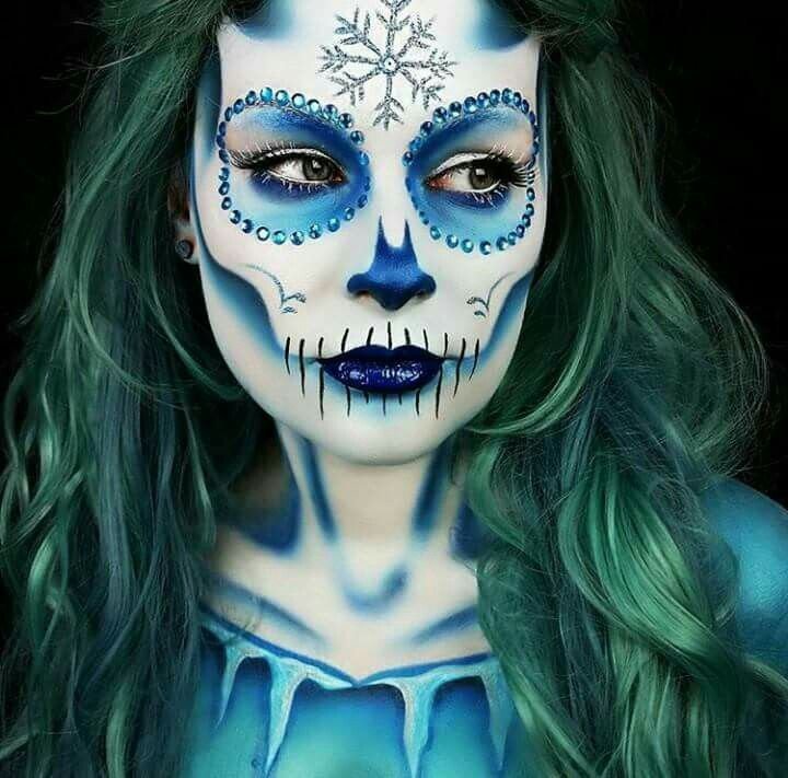 Combine icy blues, frosty whites, and shimmering silvers to create a skeleton straight out of a frozen nightmare. Highlight bones with glitter and add snowflake details across the face or temples.