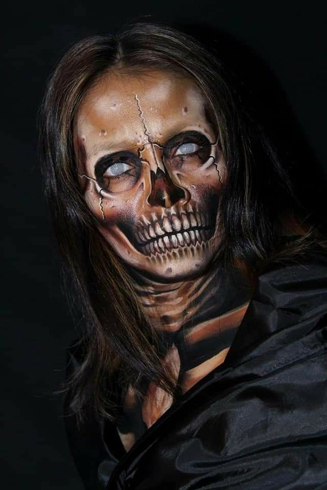 Try a cracked skull effect. Start with a base skeleton look, then use black eyeliner or paint to draw cracks radiating from the temples or mouth area. Shade the edges for depth.