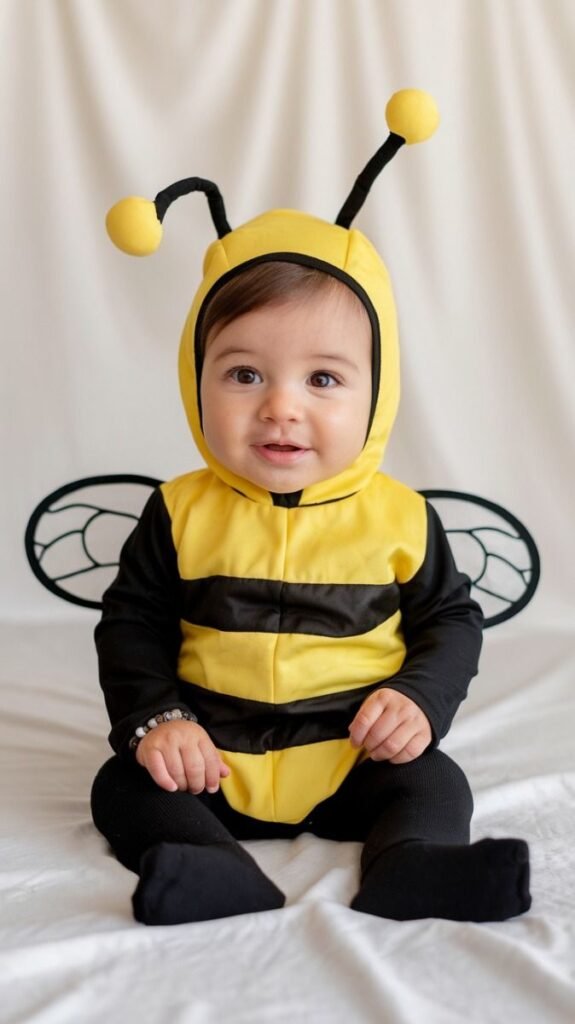 Pumpkin costumes are timeless and super beginner-friendly for new parents. Look for a lightweight, padded pumpkin tunic with a matching green hat or headband. Pair with black leggings and a long-sleeve tee if the weather’s cool.