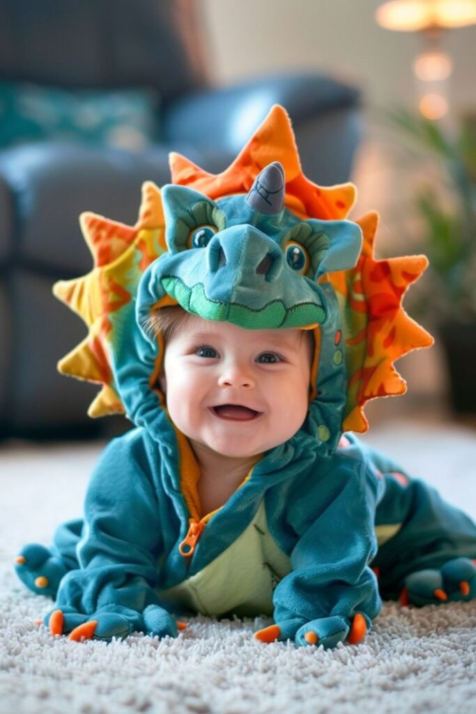 A dino costume with soft spikes down the back, a hood with eyes, and clawed feet brings prehistoric cuteness to life. You can go classic green or try fun variations like pink, purple, or blue. Make sure the costume zips or buttons easily for quick diaper changes.