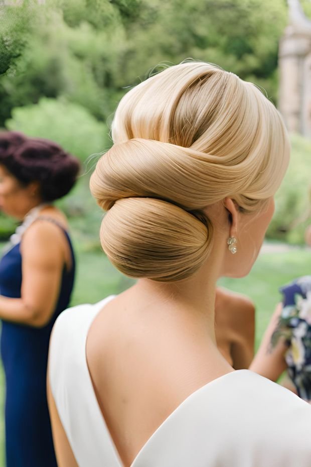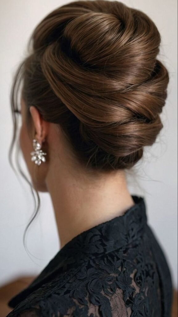 Modern versions include texture, volume, or soft waves. It’s ideal for formal weddings or black-tie events.