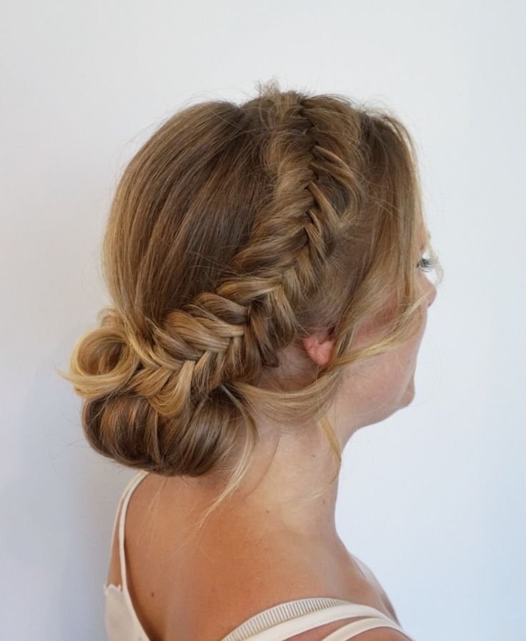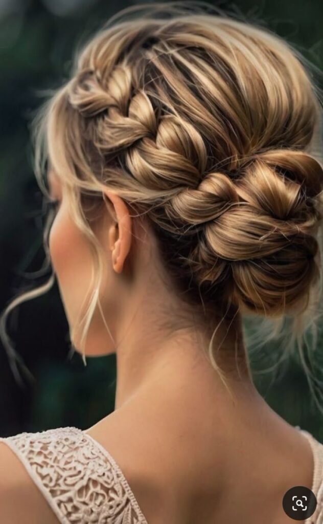 Braid your hair down the center or side, then twist it into a loose low bun. Add a ribbon or silk tie for charm.