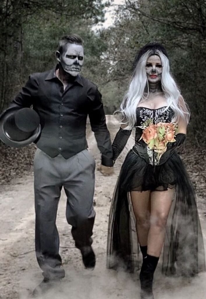 It works beautifully as a couple’s costume—and the contrast between love and horror is perfect for costume parties.