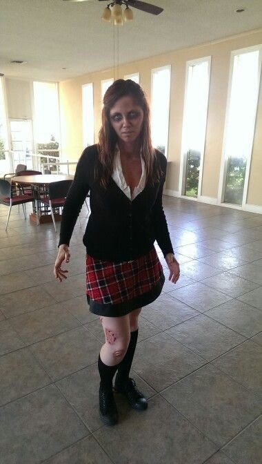 Use a pencil skirt or sweater vest and pair it with glasses, then wreck it. Add fake blood, mess up your hair, and create deep eye sockets with makeup. Carry books with fake blood fingerprints or torn report cards.