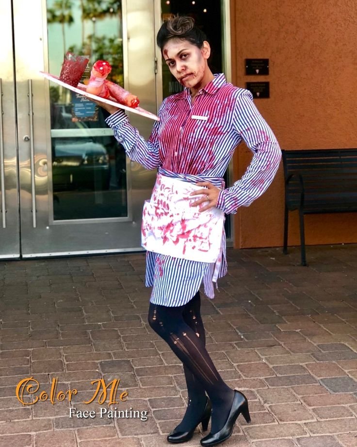 Dress as a popcorn or hotdog vendor with a blood-splattered apron and torn paper hat. Smear ketchup and mustard around your mouth for a disturbingly delicious effect.