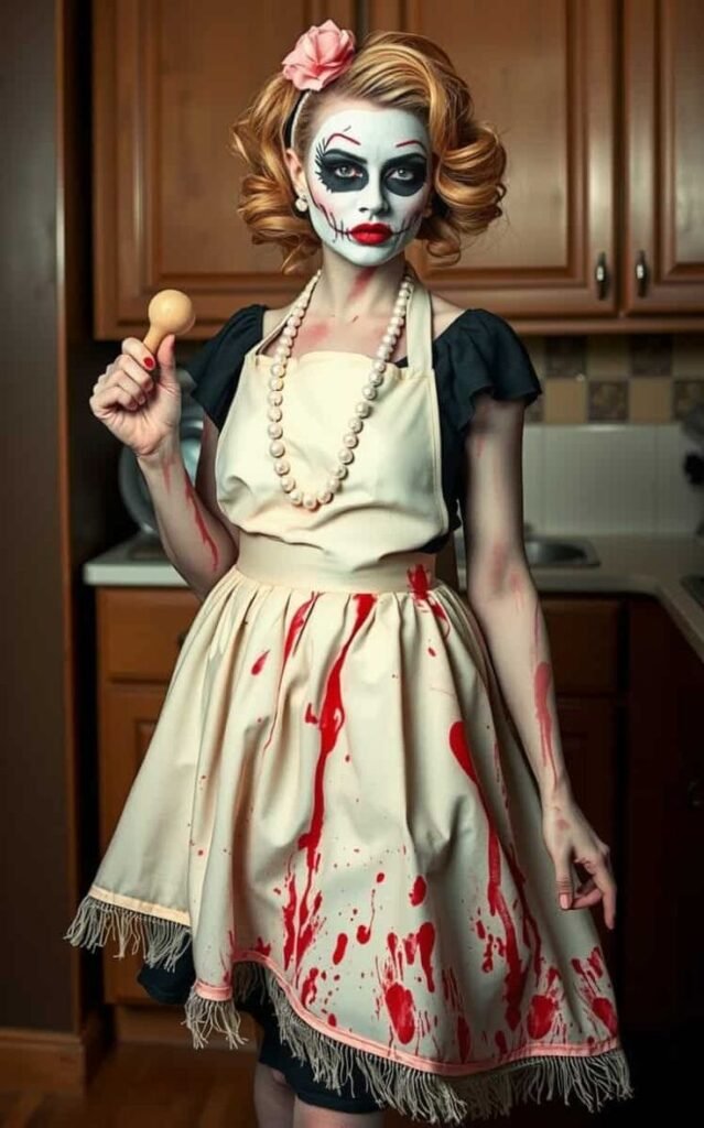 Wear a chef’s coat, hat, and apron—then distress with red splatter, fake cuts, and a cleaver or spatula prop. Black out a tooth, mess up your hair, and give your dishes a scary twist like “Brain Stew” or “Finger Fries.”